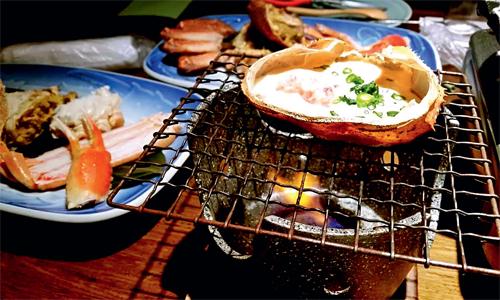 在友愛荘的全蟹宴里,就有一道慢火烤松叶蟹壳,看着蟹壳里冒出香气泛起细密的小泡沫,就胃口大开。房间里香味满屋,蟹膏的鲜味在口腔中回味久久。还有一道松叶蟹腿两吃,放在小烤炉上烤或是火锅煮着吃都很鲜美。最妙的是用多种蟹肉涮完火锅之后,用浓郁的汤底做杂炊,满满幸福的味道。