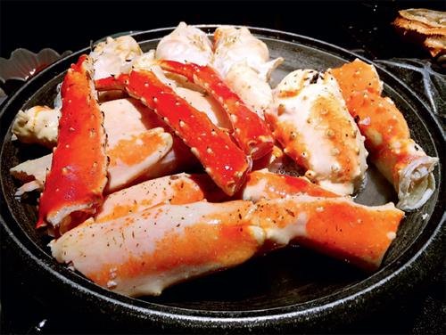 鳕场蟹其实就是帝王蟹,种类多样,因盛产于鳕鱼栖息海域而得名。鳕场蟹全身的精华在其大块诱人的蟹腿肉,因为肉质厚实,相对于刺身生吃,更适合烧烤或烹煮。在かに本陣友愛荘吃的是蟹料理店中最常见的做法——陶板烧鳕场。但北海道出产鳕场蟹食材让这道菜变得与众不同,更显鲜美丰腴。吃的时候还可以在陶板中加入酒或汁调味,吃出别样风味。