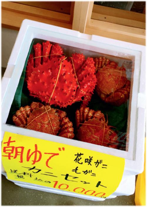 最后登场的是花咲蟹。花咲蟹腿比近亲鳕场蟹小一号,味道却更鲜美。原本的栖息范围就仅在北海道东面的根室地区一带,渔汛期也主要集中在夏天到秋天。有限的供应令其在冬天很少被餐厅收录,也是北海道螃蟹清单中此次唯一没吃上的,也没能见识北海道将花咲蟹连壳烹成味噌汁的特色料理“铁泡汁”。直到最后一天中午在网走的渔市场,我才在一家店铺的门外见到被作为招牌摆放的花咲蟹。