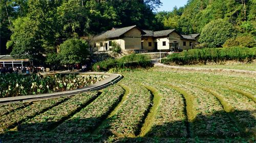 冲中并不都是池塘,上屋场对着的就是肥田沃土。曲线优美的田中畦垅之上是一行行绿色的菜秧,南岸前池塘里是稠密的绿色荷叶,池岸、山脚的绿色茂林映衬着田地的开阔,显示着土地冲空间的丰富层次。上屋场在冲的深处。