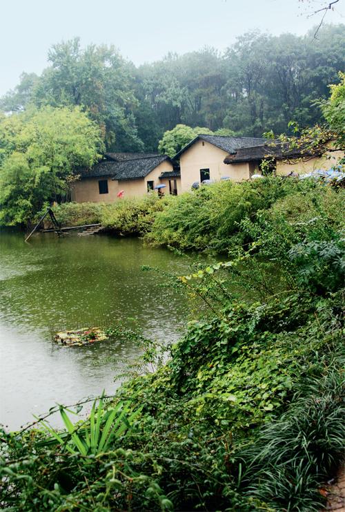 从道路拐弯处就看到刘少奇故居前的湖了。故居在湖的东面,是黄泥巴墙面的房屋,隔湖远望很小,沿路越走越离得近,那片房屋越显高显大显宽。湖西是小山,围湖的树丛荆丛茂密,故居与小山隔湖相望,环境优美秀丽。这里就是炭子冲了,路南的地势高拔,形成台地。