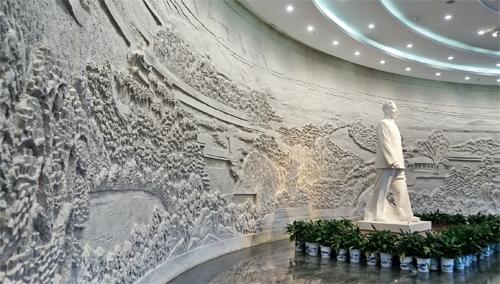 纪念馆大堂的壁雕极具震撼力,那是幅气势宏大的壁雕画,莹白色,拉毛质感的浮雕。雕刻的是花明楼一带的山山水水,还是代表性的祖国山河我看不出来,但视觉冲击力绝对强大,高而长,占了大厅后墙的整面墙壁,弯成弧形。刘少奇的汉白玉雕塑位于壁画正前方,也是通体的白色,信步行走的身姿,目光炯炯,坚毅而自信。这白色的行走雕像和背景壁画内涵丰富,不仅引人注目而且还引人遐思。