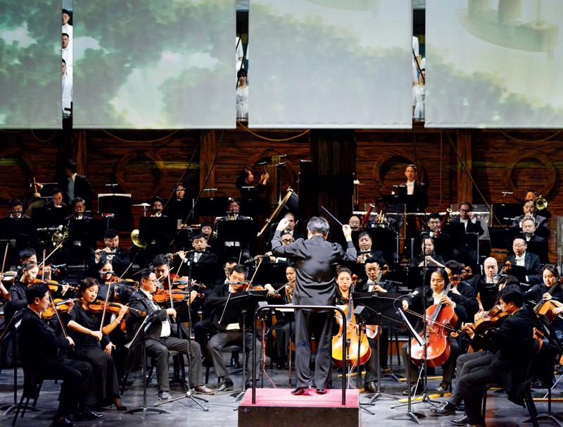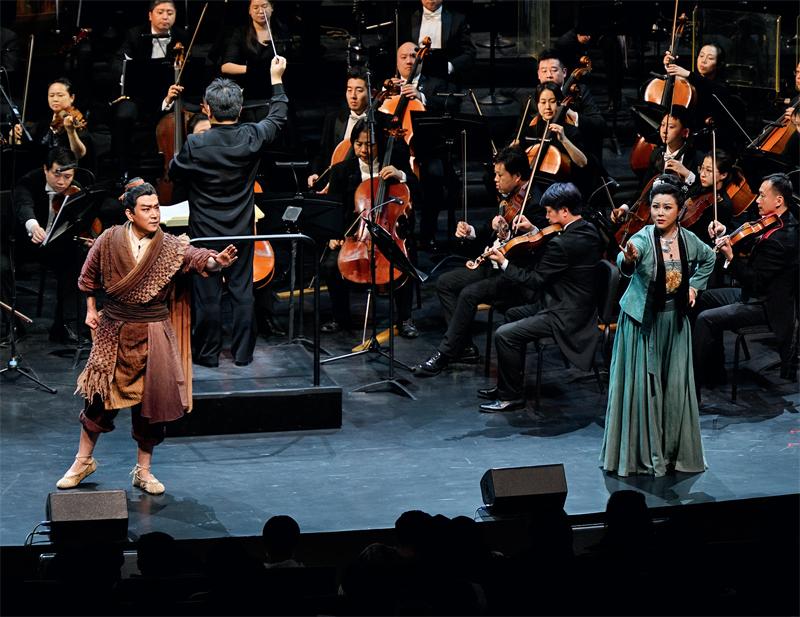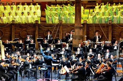 合唱、男声齐唱、男女声重唱、老生与旦角的轮唱,背景画幕下,京剧器乐、西洋交响乐的交替互依与合鸣,您沉醉在历史与现实、联想与感怀的画卷里,由不得心中也与男领的合唱一起“哟喔,嘿!晃起来,嘿!哟啦啦,嘿!嘿!”地吼喊起来。