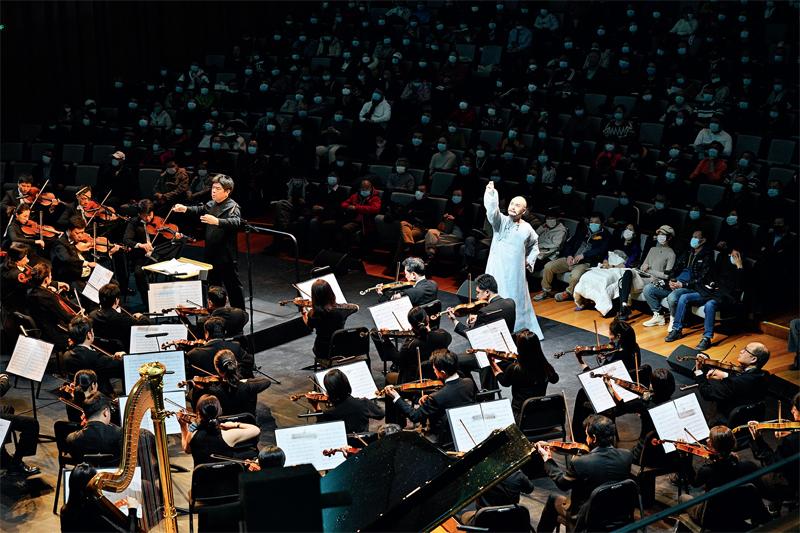 对京剧交响套曲《京城大运河》的观众们来说,天幕燃灯塔的布景、60人之众的合唱队、80人之众的交响乐队、化了彩妆的男女京剧演员们的表演,不仅展示的是一幕大运河源头通州的几百年漕运风景、运河风情,更是一种极富新鲜感的,足可醉心的艺术形式带来的艺术享受。是在听传统的西式交响乐吗?显然不是。是在听京剧彩唱叫折子戏吗?也显然不是。京剧由交响乐队伴奏,50多年前就开始有了,京剧《智取威虎山》就是。这里的京剧彩唱唱的不是某出京剧的折子戏,唱词倒是五字句、七字句的组合,但它们都是新创作的,是紧扣《京城大运河》内容,展示《京城大运河》情境、情节,叙述京城大运河故事的。《京城大运河》不是京戏,它有合唱团的合唱。京剧风格的彩唱是嫁接到西洋交响乐合唱中的领唱?但这京剧的彩唱,老生是老生的,旦角是旦角的,韵味十足,没让京剧票友京戏戏迷们迷失、失望。京剧的锣鼓和胡琴也加入到乐队中演奏,与交响乐队演奏的风格迥异,特色鲜明又浑然交织成一体。京剧彩唱、合唱、合唱队领唱、京剧打击乐,都是京剧交响套曲《京城大运河》的有机组成部分。作品从艺术形式到内容都是创新。