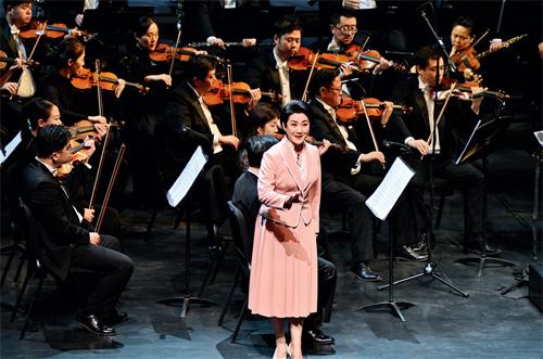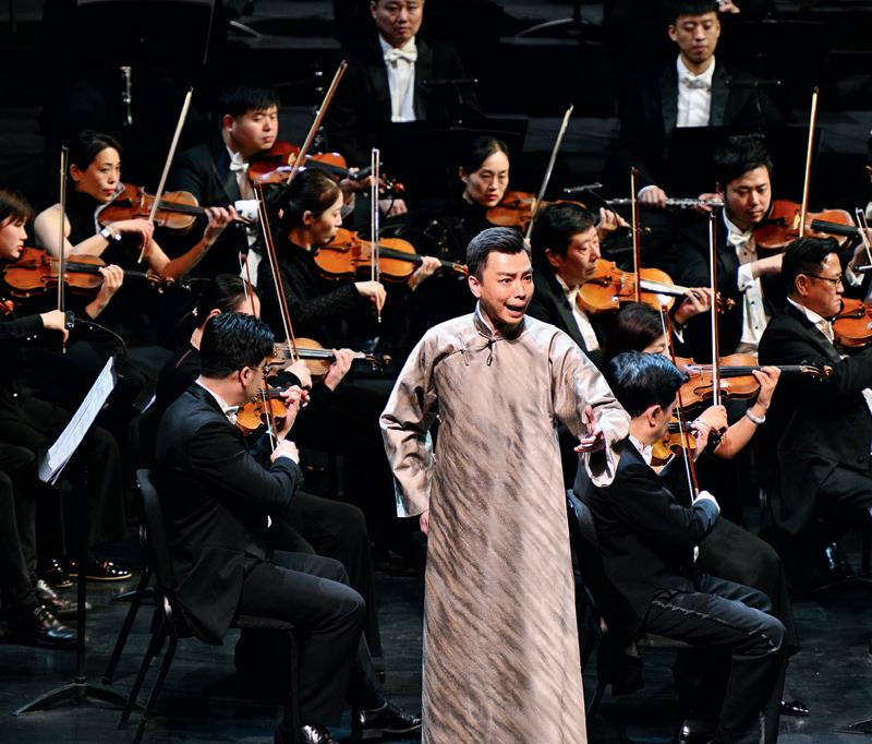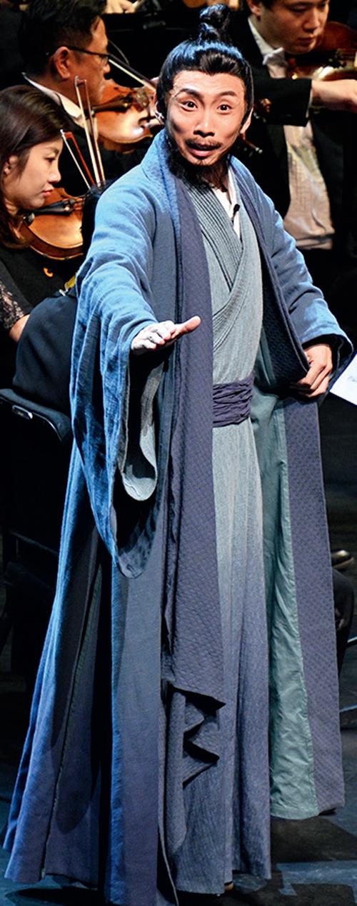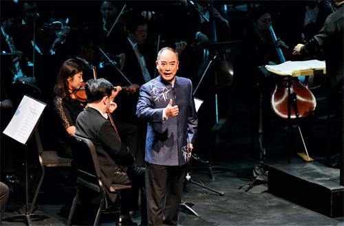 老生朱强的咏唱拉开了第三乐章《漂来的北京城》的序幕。这个老生是马(连良)派老生,张学津的首开山门大弟子,北京京剧院领衔主演。他的唱词由翁思再创作,对称的两段,有副歌。有副歌的唱词在京剧唱腔中是否常用我不知道,它有可能属于戏歌,用的是西皮原板,唱出古代棹歌,传诵着元明清长河上的御舫航行到大都城。漂来了鱼米之乡,山珍海味;漂来了雕梁画栋,玉桥拱门;漂来了民族融合,地灵人杰;漂来了中原之韵,五乡之亲。赞歌式地强调,这是漂来的北京城,这是跃动的中国心。这两段重复性句式的唱词,照理应该用混声合唱来表现,它却用了嗓音醇厚的老生。老生的叙事抒情性诵唱浮跃在交响的器乐声中,合唱队集体沉默。转接二黄导板,一句“千里运河扬归帆”,交响套曲已进入另一乐段,老生已易人,演唱者为师承杨乃彭、谭元寿等名家的杨少彭。