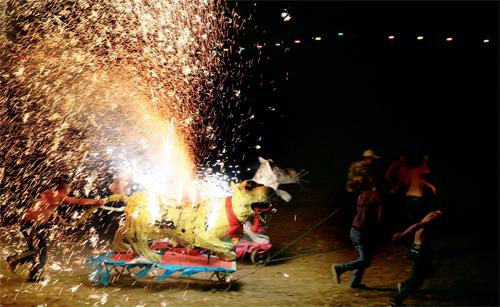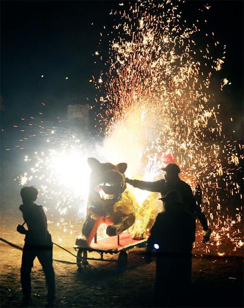 一声炮响,一个村民引燃了老虎火,三个赤膀小伙直奔向老虎火,前面两个人拉,后面一个人扶着虎尾巴在火场里开始奔跑起来。这时在虎中的“锅子火”等烟火呈现了火在虎上,人在火中,人腾虎跃的壮观景象。隐藏在老虎背部的各种“锅子火”也次第绽放夜空,耀眼夺目,时而如千万朵金菊,遍地开花,争奇斗艳;时而如一株株盛开的火树银花,火光四射,绚丽多姿;时而如沉寂千年的火山喷发,岩浆崩射,直冲云霄,辉映着整个夜空。一时间,这场时隔许久再次绽放的烟火,点燃节庆热闹的气氛,周围的村民也纷纷加入了这场“狂欢”,和白天静谧的村落截然不同。