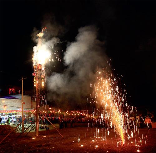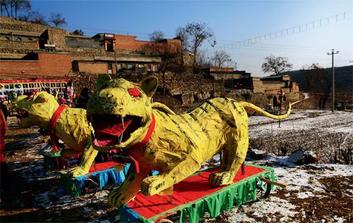 这个坐落在井陉县西南部深山区的村落,因地势较高,村民深居简出,平日里比较安静,但同时仍保留着传统的节庆方式,老虎火便是他们庆元宵的方式之一。老虎火顾名思义,就是用制作成老虎等各种形状及故事情节的道具放烟火。这门相传于康熙元年(1662年)的技艺,是张井林祖辈在山西学了三载而得。当地世代相传燃放烟火的习俗,便是为了纪念这位宗师。清代后期至新中国成立前,南张井烟火因制作巧妙、内涵深刻丰富,一直是县城元宵花会的压轴戏,称为“官火”,距今已有350余年的历史。
