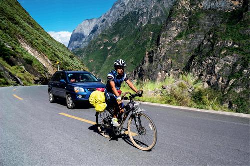 以骑行的方式在中虎跳的峡谷公路上。