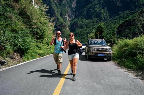 来自英国的情侣在中虎跳徒步。