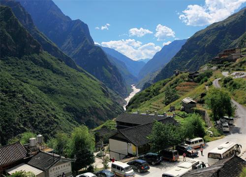 中虎跳渐渐离我们越来越远,途中壮美的景色也越来越少。没有了大片的植被,只见一些灌木丛和低矮的绿色植物分布在悬崖峭壁下,还有两岸耸入云霄、犬牙交错的山峰和一条望不到边的公路蜿蜒向前。悬在空中的巨石虽然能避风雨,但不敢去躲避,唯恐它会掉下来。途经一塌方处,道路堆积起大量的泥土和风化石,从山上冲下的洪水把泥石冲出两道大沟,半山斜坡处的碎石也在不断地往下滚。看着这惊险的场面,我们丝毫也不敢停留,鼓足劲头拼命地朝前面的拐弯处跑去。这时,只听得背后传来轰隆一声,又有石头塌下来。