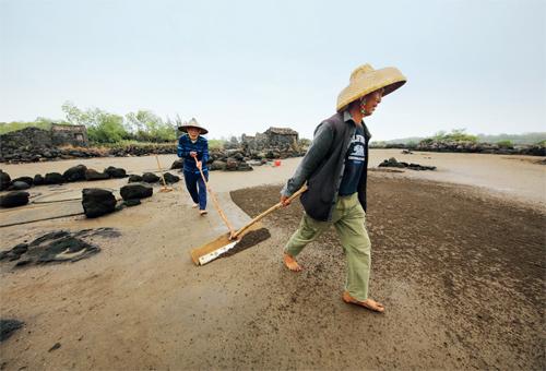 李如龙和弟弟李如丰(图右),辛勤地将潮起潮落海水浸泡又晒干、已经饱含盐分的泥土收回。