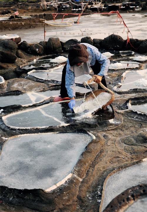 盐丁路入口处,一块白色的石板斜倚在几块巨大的玄武岩石间,上面似有雕刻,已模糊难以辨认,细看纹理状似人形。当地晒盐世家出身的李如龙介绍,“这是自古以来当地盐丁供奉的盐神,至今他们每当进入盐田,都向盐神祈祷阳光和海风。”