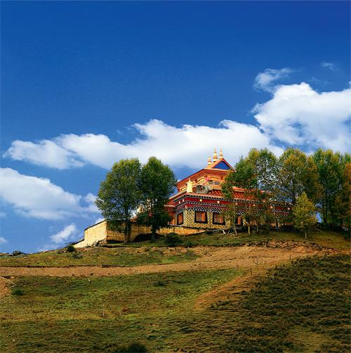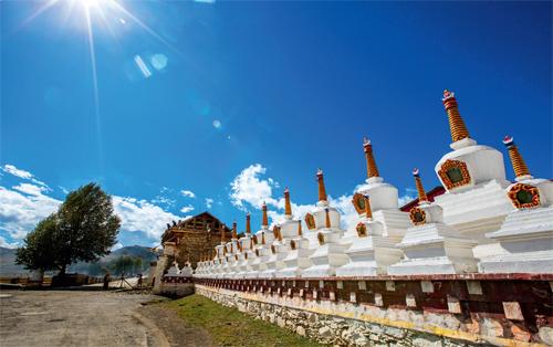 继续前进,在离道孚县城几公里之外的格西乡,便能将道孚县城尽收眼底。不愧是“世界民居艺术之都”,首先呈现在面前的,就是那鳞次栉比的藏式民居。这些民居外表主要由棕白两色构成,白色的屋顶,白色的主墙,木结构处多用棕色颜料染涂,其间配以红色、蓝色图案,在蓝天白云、青山绿水的辉映下,幻化成妙不可言的积木图案。
