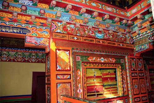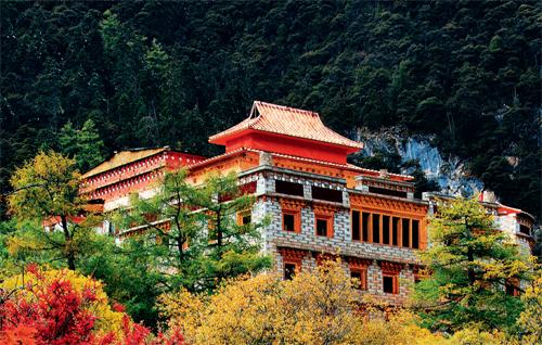 在草原的最远处,只见一些隐约的红色在天尽头处探出了头。“好漂亮!那必是正宗的道孚民居了!”我的心跳开始加快。走近了才发现,黄色的宅院围墙,红色的藏房木结构主体,色彩丰富的建筑檐楣,宅院内外是挂满苹果、石榴、梨子等累累果实的果树。墙头翘角处摆放的花盆,一切都很平凡,但是这种平凡却传递出难以言喻的和谐之美!让远道而来的我们,顿时为这种宁静的自然之美深深倾倒。