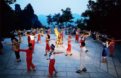 现在,这里层层梯田,青松翠竹,有如桃花源。寨内村民并没有因外来客闯入他们的生活而有丝毫改变,田间地头处处能见到他们忙碌的影子。在闲暇之余,当地人随口就能唱出一首首未经编排的土家族山歌。其中一首《借个月亮对山歌》很是婉转动听:“一树樱桃花,开在岩角下。蜜蜂不来采,空开一束花。喊一声我的哥,山坳坳的月亮爬上了山坡……风雨桥上等着我,借个月亮对山歌……”