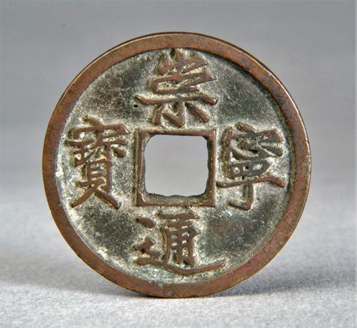 北宋崇宁通宝。崇宁通宝四字字体为北宋徽宗赵佶自创的瘦金体,由宋徽宗御笔亲书,被称为“御书钱”。