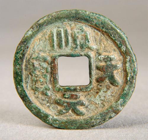 每个博物馆都有属于自己的镇馆之宝,逛了一圈古币馆一层的第一、二展厅,总结了一下,还真有三个镇馆之宝可以拿出来晒晒。第一个就是最“丑”的镇馆之宝。据说在五代十国时期,刘仁恭、刘守光父子割据幽州(今北京地区),并自称“大燕国”。为了聚敛财富,父子俩将幽州境内的铜钱强行收缴,埋藏于天安山(今房山)山洞内,令境内全部流通铁钱,铁钱不足,甚至下令行用泥钱。刘氏父子所铸的铜钱较少,遗留后世的更是凤毛麟角。古币馆第一展厅中展出的顺天元宝背“一十”字便是刘氏所铸铜钱,且迄今为止,国内外尚无第二枚发现。整枚钱币的直径为3厘米,风格鲜明,是古币馆当之无愧的镇馆之宝。