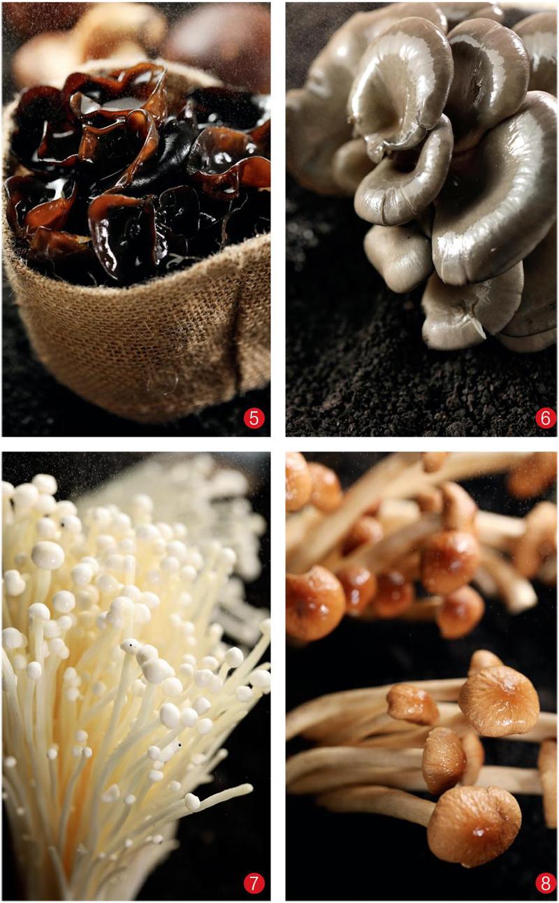 5 东北秋木耳。6 鲜平菇。7 金针菇。8 鲜海鲜菇。