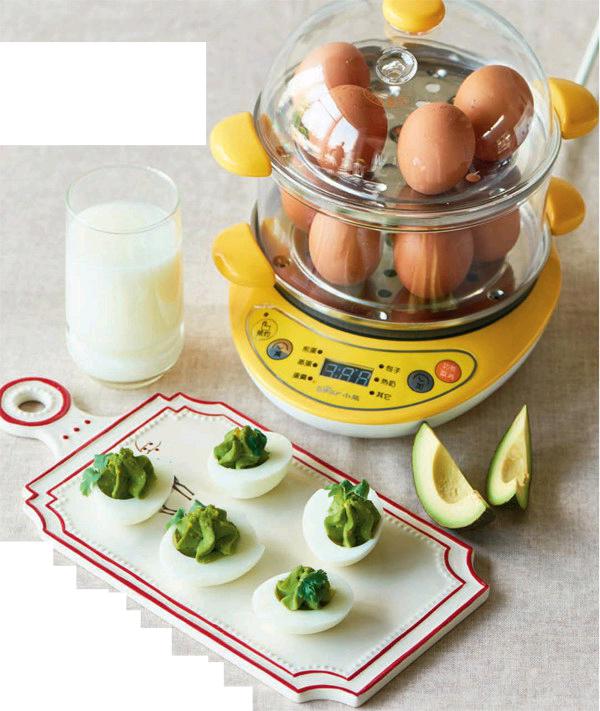蛋黄、牛油果块、沙拉酱、蜂蜜芥末酱、柠檬汁、盐、胡椒粉混合后搅打成蓉,装入裱花袋中,挤入蛋白盅内,再加上香菜叶,撒上辣椒粉点缀。食用时,搭配热牛奶即可。