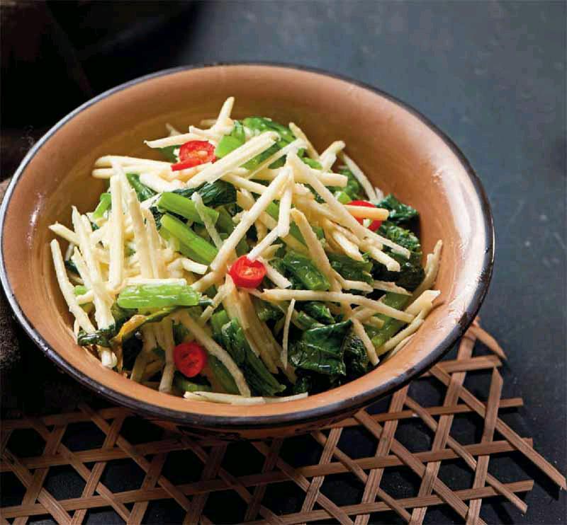 另两道我很喜欢的冬笋料理就要数塔菜冬笋和雪菜笋丝了,一道是冬笋和时令鲜蔬的组合,另一道则是冬笋和腌菜的化学反应。若非要说哪道菜更胜一筹的话,我还真说不上,只能说各有千秋。说来也有趣,上海人报菜名的时候会说“塔菜冬笋”,但单独说“塔菜”的时候却习惯叫“塌棵菜”,有人说是因为塔菜形状扁塌,微微有点苦味(上海话中“棵”与“苦”同音)而得名,虽然不明真相,但我倒是觉得“塌棵菜”的叫法要来得更为生动。我素来觉得略带苦味的蔬菜特别打动人,炒菜的时候除了盐再加一点点糖,整道菜的味道就会特别丰富。大概我对雪菜笋丝的迷恋也源自于对这种咸中带甜的喜爱吧!做雪菜笋丝最好用新鲜腌好的雪里蕻,新鲜的雪菜梗够爽脆多汁,颜色也漂亮,袋装的雪菜首先卖相就逊了一筹,吃口上有时也难免有点“烂糊糟糟”,只能作为次选。不过,再美味的雪菜笋丝也很少有人会空口吃吧,我最爱的搭配是将它作为汤面的浇头。将做好的雪菜笋丝倒在面上,用筷子将面和浇头搅匀,之后的每一口都有面、有雪菜、有笋丝,面的爽滑、雪菜笋丝的鲜美爽脆交织在一起,不知不觉就干下了一大碗。不多说了,饿了,下楼吃面去了。