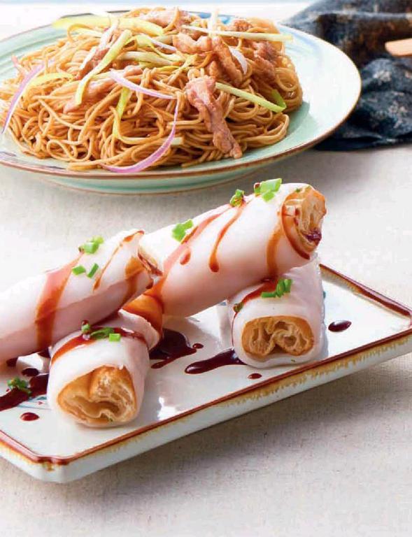 1.用热的肠粉皮将新鲜炸脆的油条卷起来。
