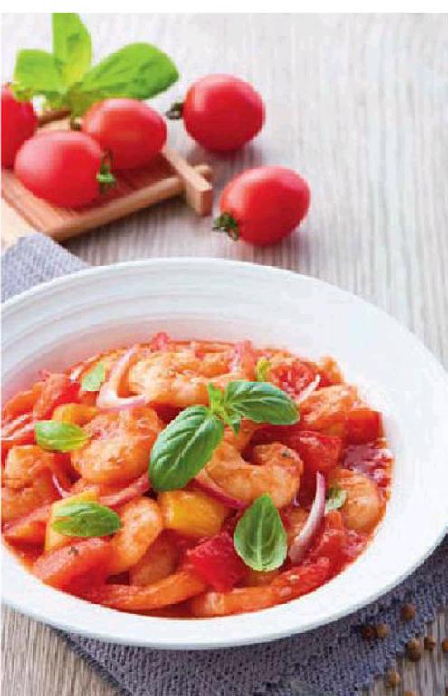 ·锅内留底油,下红、黄彩椒片、洋葱片、番茄块炒匀,放入基围虾仁,加鱼露、白糖、柠檬汁、罗勒碎、味好美研磨瓶白胡椒粒,挤上味好美番茄沙司翻炒均匀,最后撒上罗勒叶即可。