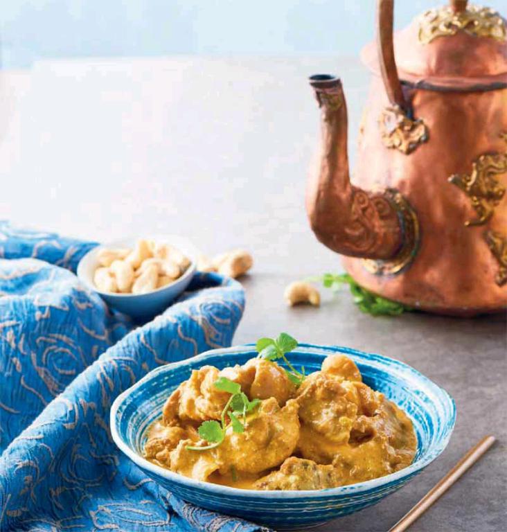 500克羊肉/10克腰果、花生、白芝麻、椰子粉/20克番茄酱/10毫升奶油/1茶匙姜黄粉、芫荽粉/2茶匙酥油、辛香料粉、姜蒜酱/适量盐、香菜、油