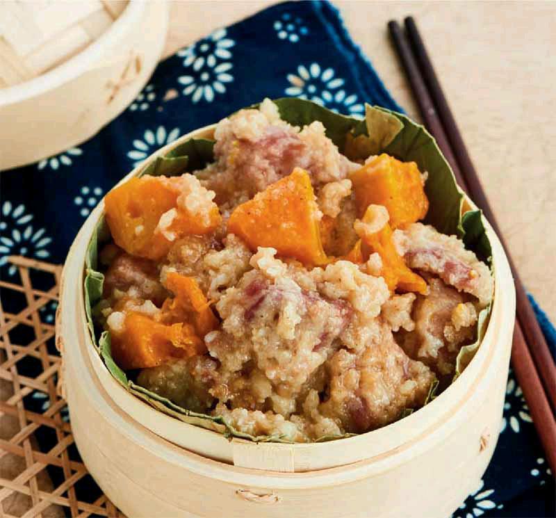500克猪小排/200克老南瓜/50克蒸肉米粉/1张荷叶/适量料酒、盐、老抽、生抽、胡椒粉