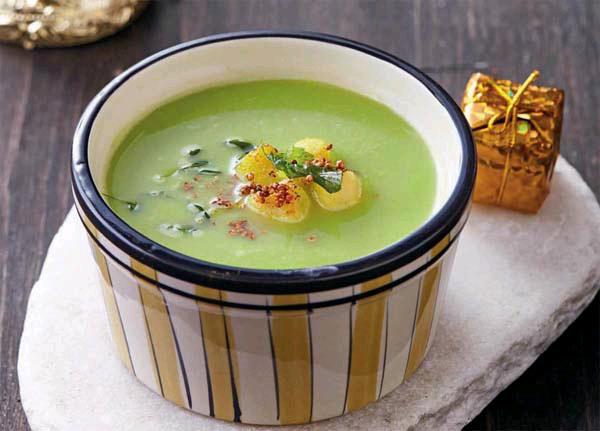豌豆汤回锅小火加热,挤入青柠檬汁后离火倒入汤盘中,再放入炒好的扇贝肉等装点即可。