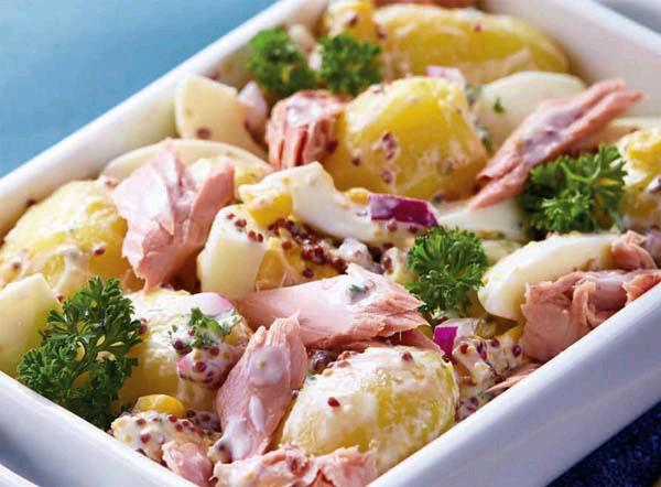185克罐装金枪鱼/1个鸡蛋/6个小土豆/20克罐装玉米粒、芥末酱、蛋黄酱/10克法香、红葱头/3克黑胡椒粒/1茶匙盐、芥末籽