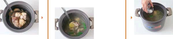 6.苏泊尔陶然养生煲内注入适量清水大火煮开,放入鸡块、笋干段、葱碎煲煮,再加入甜豆炖煮至熟。