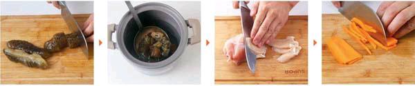 150克海参100克鸡胸肉50克玉兰片、鱿鱼卷25克熟地黄、胡萝卜10克青蒜15克当归5克葱1汤匙料酒适量盐、油