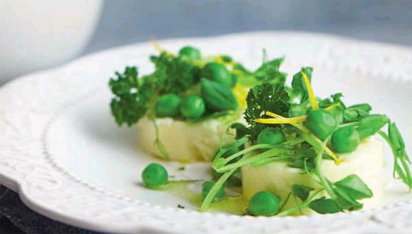 1升全脂牛奶/1个柠檬/1/2茶匙盐/适量豌豆、豌豆苗、法香
