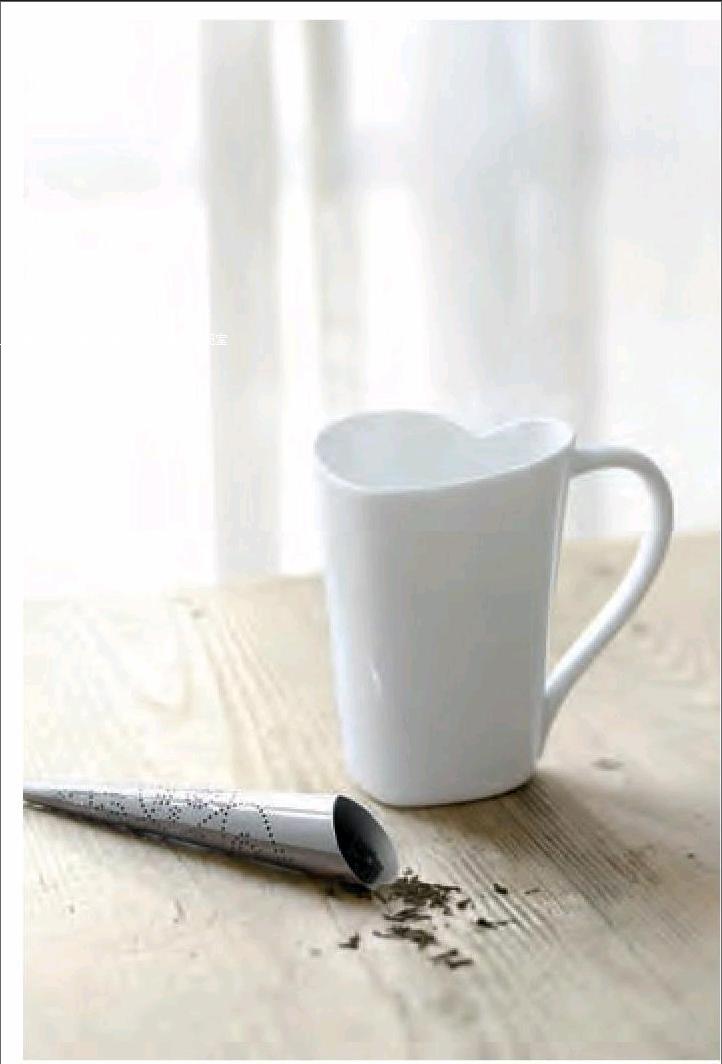 白色陶瓷马克杯搭配不锈钢茶叶器皿,特别之处在于爱心的杯口,浅酌一口,温暖于心,是送给伴侣的不二之选。