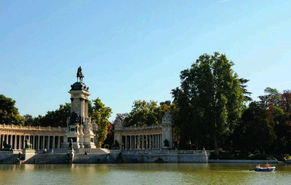 在马德里巴拉哈斯机场的游客服务中心,我领到了一张马德里地图,才发现城中心分布着大大小小的公园,原来马德里是属于绿色的。不喜欢宅在家里的马德里人,更喜欢在路边的咖啡店晒着太阳,你甚至可以在游人熙熙攘攘的大皇宫对面,看到有人躺在闹市街道的草坪上,心无旁骛地阅读。这么颇有魄力的生活态度,着实令人羡慕。而在马德里人心中,生活自然离不开公园。著名的丽池公园留下了许多游客的脚印,但当你用心去融入马德里人的生活时,便会发现它那掩映在四季流转的美景下,赐予给人们生活的神奇魔力的场地。从独立广场(Plaza de la Independencia)对面的入口进入被绿色拥抱的丽池公园,可能是周末的原因吧,每个人都能拥有属于自己的宁静公园。无论是坐在长椅上听着歌的情侣,还是在湖面上划船的健硕男人,抑或是带着孙女散步的老妇人,无不乐享着属于自己的马德里生活。偶尔遇见亚洲人的面孔,大多还是如我一般,看客的姿态窥视着这一切的美。但倘若你多停下脚步,也许短短的几十分钟,却可以感受到一种生活。向导Natalia告诉我,这个公园对她的意义非凡,这里有着她小时候和姥姥的玩耍记忆,有着和初恋男友约会的记忆,也有着她带着孩子玩耍的记忆。丽池公园几乎对于每个马德里人来说,这里或多或少都会充满着故事。