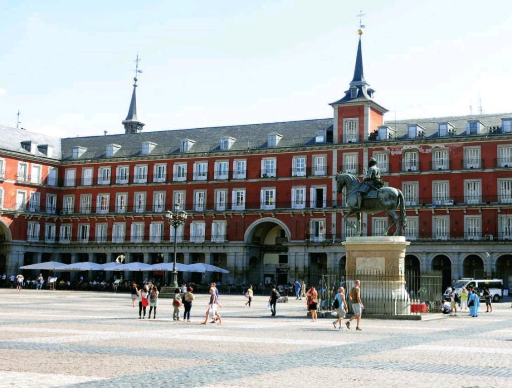 马德里的市中心真的很小,脚步轻盈地走在石板老路上,视线不禁向下观察,西班牙的制鞋工艺真的是将轻便与美观完美融合。在马德里旅行,你需要一双步行好穿的鞋。行穿梭在小巷子里,见得最多的就是旅游纪念品店,“C罗”、“梅西”的海报或明信片总是对你打招呼,充斥着纪念品的商店遍布大街小巷。马约尔广场(PLAZA MAYOR)为中心的黄金区域是马德里的精髓所在,这里白天是游客如织,许多街头的艺术家表演着有趣的故事,而骑着骏马的士兵出现在广场上时,所有人的视线都被他们的皇室气息所吸引。广场中心的回廊有许多露天的咖啡馆,走累了,不妨坐在太阳伞下喝一杯咖啡。其中西边的中间地带是马德里会议局的办公地,一楼对外开放,你可以在这里任意咨询,也可以拿到免费的旅游手册,惊喜地找到了中文马德里观光手册,很是贴心。这里还售卖马德里卡(Madrid Card),分为24小时、48小时、72小时和120小时,很适合自由行的游客。