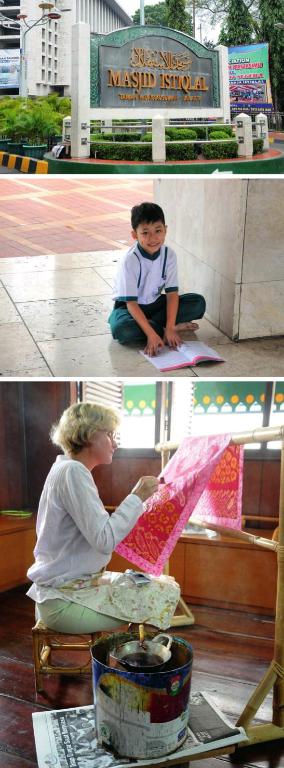 蜡染在印尼语为Batik,是印尼国宝级的手工艺文化。在雅加达纺织品博物馆里可见蜡染在印尼多个民族服装中均有很大的应用比例。但在一路的旅程中,也只是在街边大大小小的商铺中看到了蜡染成品,直到在纺织品博物馆后面的蜡染学习班里,我们才有幸参观到蜡染的制作过程。