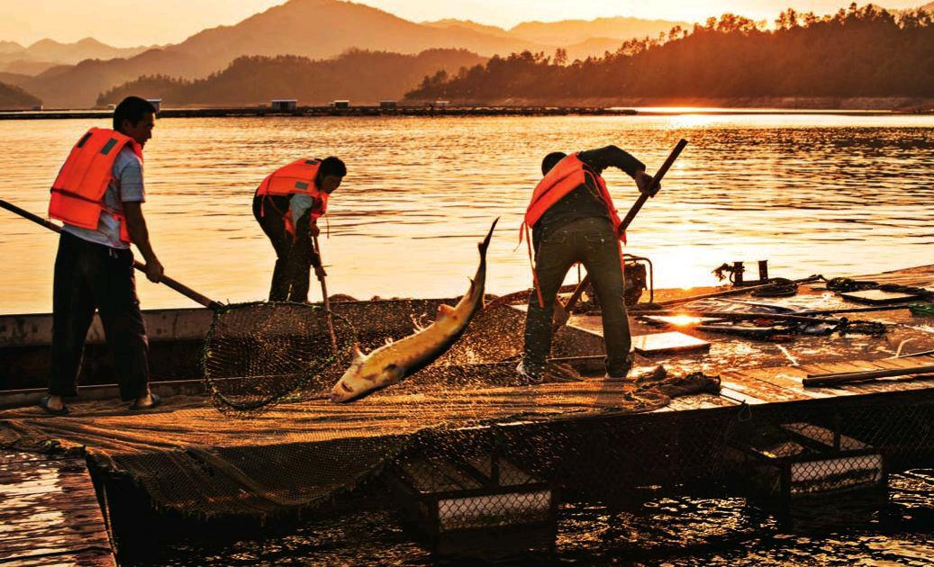 远处马达轰鸣打破湖面的平静,渔船从度夏池运来一船鲟鱼,在这里进行“倒鱼”。一些体型较大的鱼由于身上有黏液极难捕捉,工人只能站在船上的水槽里将鱼抱出来放在帆布制成的“担架”上,然后奋力抛入池水中,小一些的鱼便用巨大的捕鱼网一条一条地捞出来抛入池中,鲟鱼巨大的身体入水后溅起一人高的水花,人与鱼在即将隐没的夕阳中变成一幅唯美的剪影。