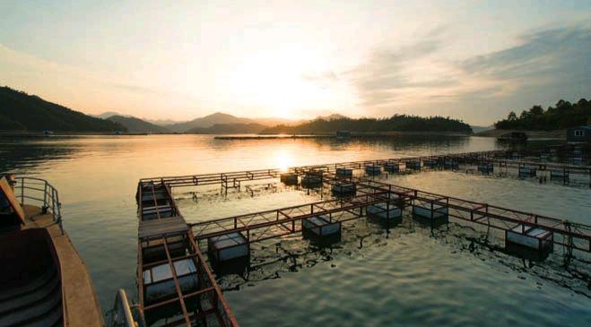 我们所在的20排围网箱被分隔成20多个大小不一的网格,有6米水深的大网中将近400尾鲟鱼,比较淘气的俄罗斯鲟和达氏鳇喜欢待在上层水域,不时跳跃起来,露出漂亮的背鳍,探出头打量着岸上的世界。水质清澈的能清楚地看见水下优雅游动的鲟鱼,阳光透过水面投射在鲟鱼背鳍上的鱼骨板上如身穿灰黑色铠甲一般。据说在某些地区会将鲟鱼作为上等观赏鱼,因鲟鱼也被称为鲟龙鱼,与亿万年前的恐龙同属白垩纪时代。而以龙为至上、吉祥之物的中国人将鲟龙鱼也视为水中的龙,是至尊、富贵的象征,且它在水中游动起来缓慢优雅、幽深古朴,也是将其作为极佳观赏鱼类养殖的原因。