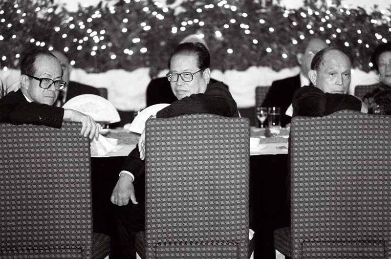 1995年底,香港特别行政区筹委会预委会在北京闭幕,李嘉诚、周南、霍英东(从左至右)在庆祝晚宴上观看演出。刘卫兵 摄