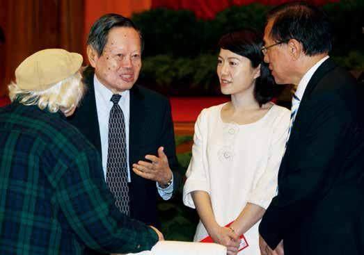 2009年秋,诺贝尔物理学奖获得者杨振宁(左二)和夫人翁帆(右二)在北京人民大会堂出席外国专家国庆招待会。刘卫兵 摄