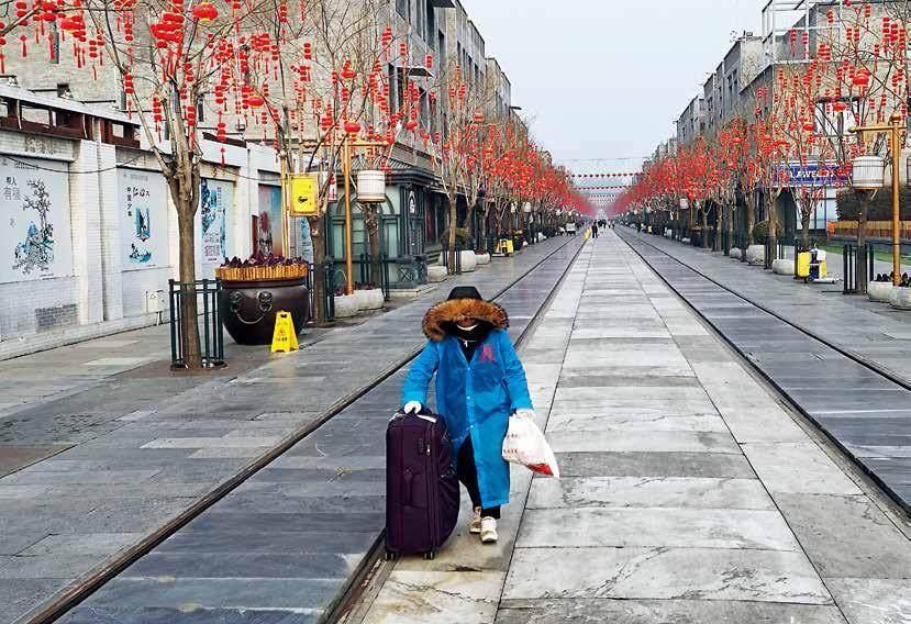 2020年1月春节,新冠肺炎蔓延全国,北京前门大街空空荡荡,一位行人推着箱子前行。刘卫兵 摄