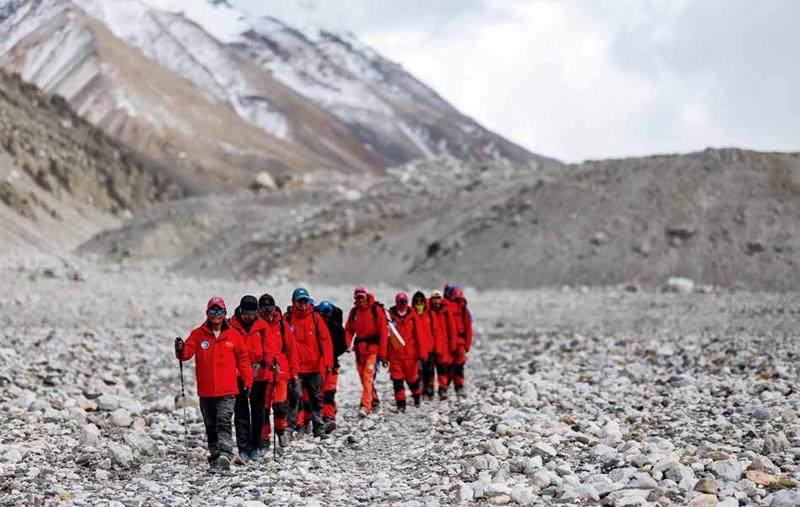 5月5日,珠峰科考工作小组副组长扎西平措(前)率领队员返回大本营。这是他第16次登顶珠峰。姜帆 摄