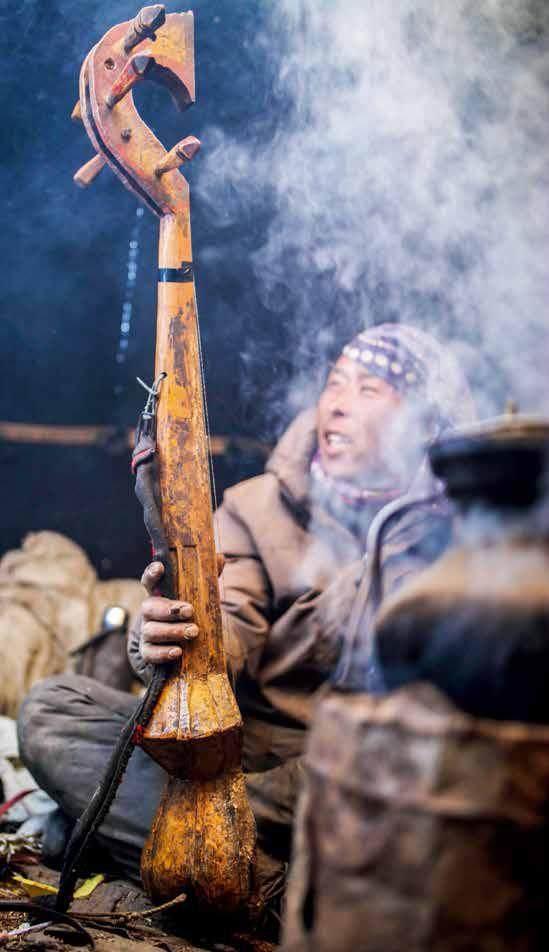 5月13日,藏普村的一位牧民在高山放牧点的帐篷里把玩乐器。姜帆 摄