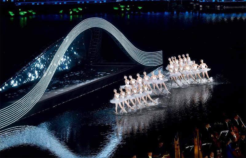 2016年9月4日,演员在表演《天鹅湖》。当日,出席二十国集团领导人杭州峰会的G20成员和嘉宾国领导人及有关国际组织负责人在杭州西湖景区观看《最忆是杭州》实景演出交响音乐会。黄宗治 摄