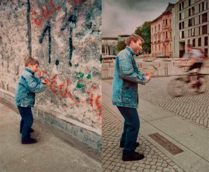 我非常喜欢克里斯托夫在柏林墙前面的那组照片。当时,我们并不知道这张老照片拍摄的具体位置,所以我们找了很久,试图找到与老照片中背景、色调一致的拍摄地点。在我们拍摄时,会有路人不断经过进入到我的取景框中,但这反倒是我所希望表达的内容:柏林墙被拆除之后,人们可以随意行走。于是,我选择了一位运动中的、骑着自行车的人进入到画面里。